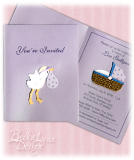 On the cover the stork carries a bundle matching the color of the card stock and on the inside the baby basket also has complimenting canopy.